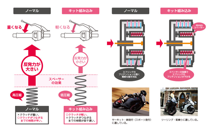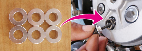 イージークラッチキットは厚さ4mmの専用スペーサーをクラッチスプリングのボルトに装着することでクラッチスプリングのプリテンションを弱くし、クラッチレバーを軽くすることができます。 その結果、クラッチレバーの操作やギヤの入りがかなり容易になり、握力の弱い方でも比較的に簡単にクラッチ操作ができるようになります。 ※ブラッシュアップキットについてはお客様の任意取り付けとなります。